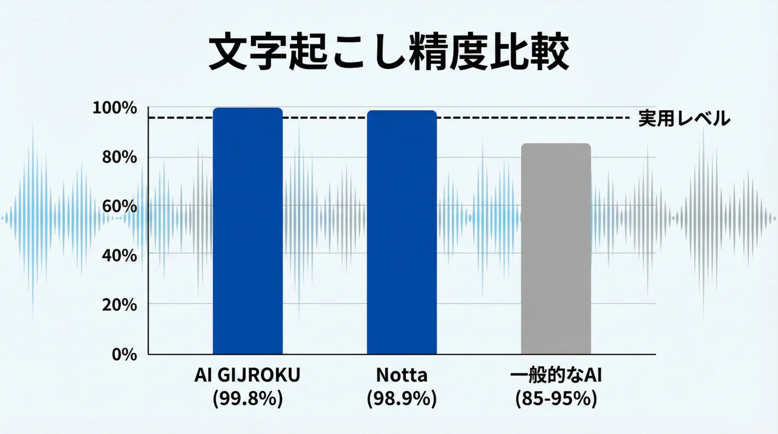 文字起こし精度は、議事録の信頼性を左右する最重要指標です。98%以上の精度が一つの目安となりますが、実際にはNottaが98.9%、AI GIJIROKUが99.8%といった高精度を実現しているツールも存在します。一般的なAI文字起こしは良条件でも85~95%程度にとどまることも多く、この差が修正作業の負担に直結するのです。