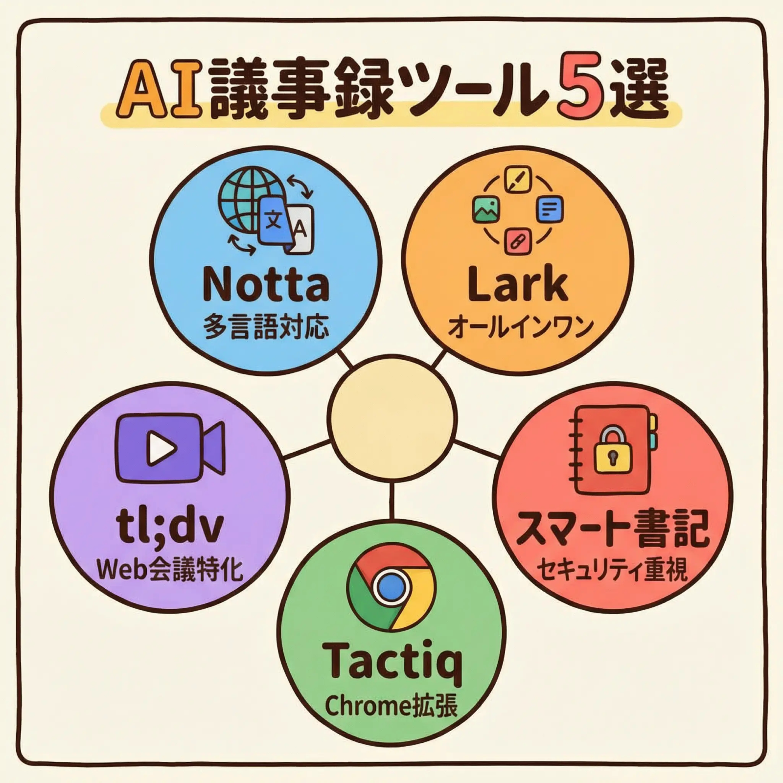 まず文字起こし精度と多言語対応に強いNotta、Web会議特化のtl;dvとTactiq、オールインワン型のLark、国産で全機能試せるスマート書記の順に紹介し、次に主要ツールの無料プラン比較表で横並び評価を行います。最後に、無料トライアルで必ず確認すべき5項目をチェックリストで示します。