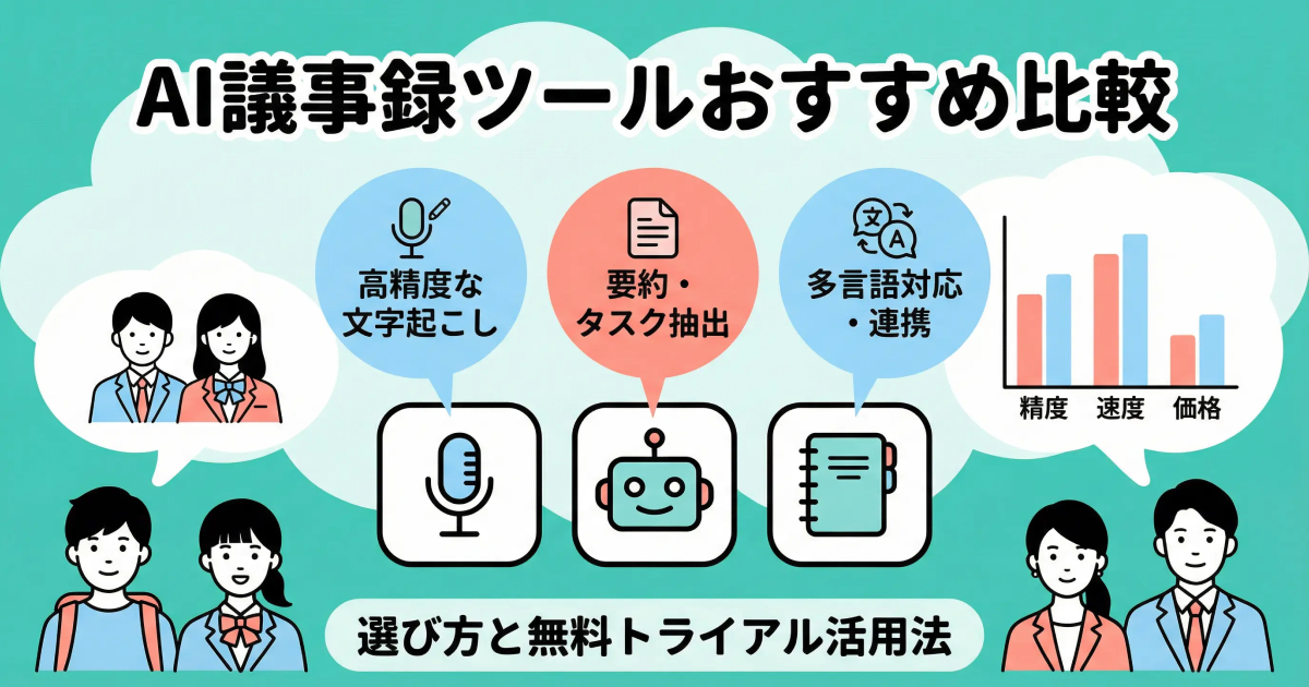 この記事では、2026年2月時点の最新情報をもとに、AI議事録ツールの選び方を6つの比較軸で整理します。対面・Web会議・ハイブリッドなど会議形態別におすすめツールを紹介し、精度98%超のツールや14日間全機能が試せる無料トライアルの活用法まで具体的に解説します。
