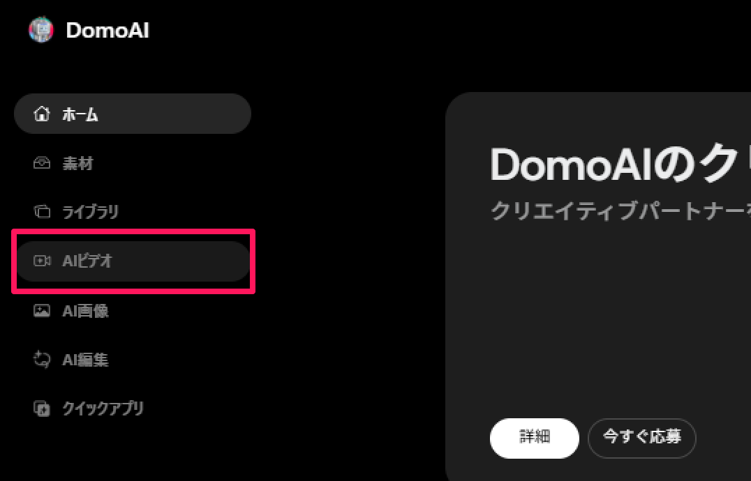 ダッシュボード左側のメニューから「AIビデオ」→「画像から動画」をクリックします。