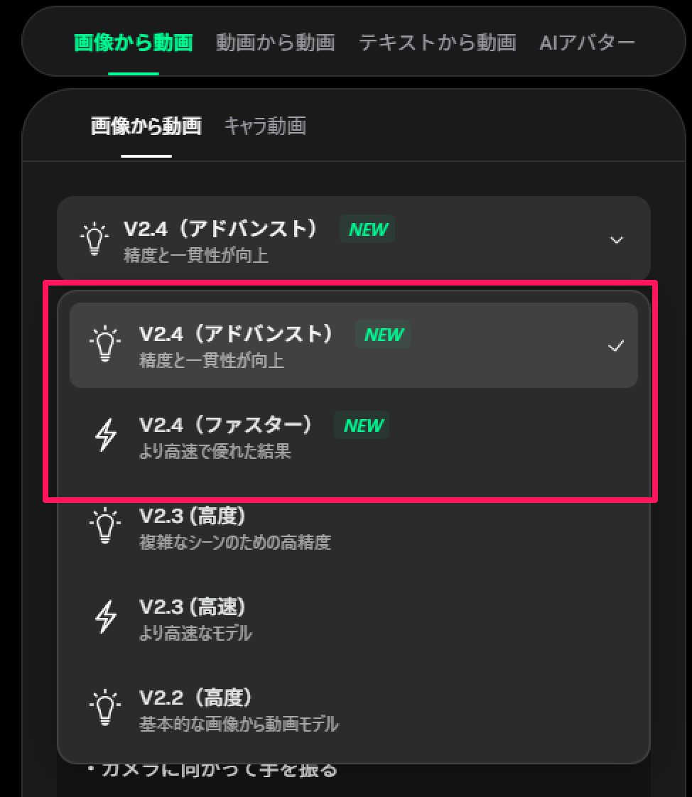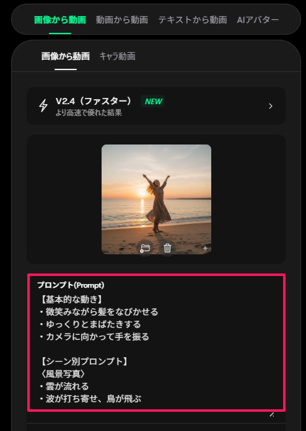 「画像から動画生成(Image to Video)」は、2025年8月の最新アップデートでV2.4に進化しました。
