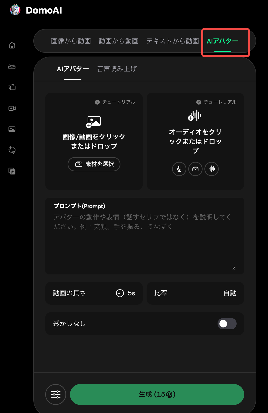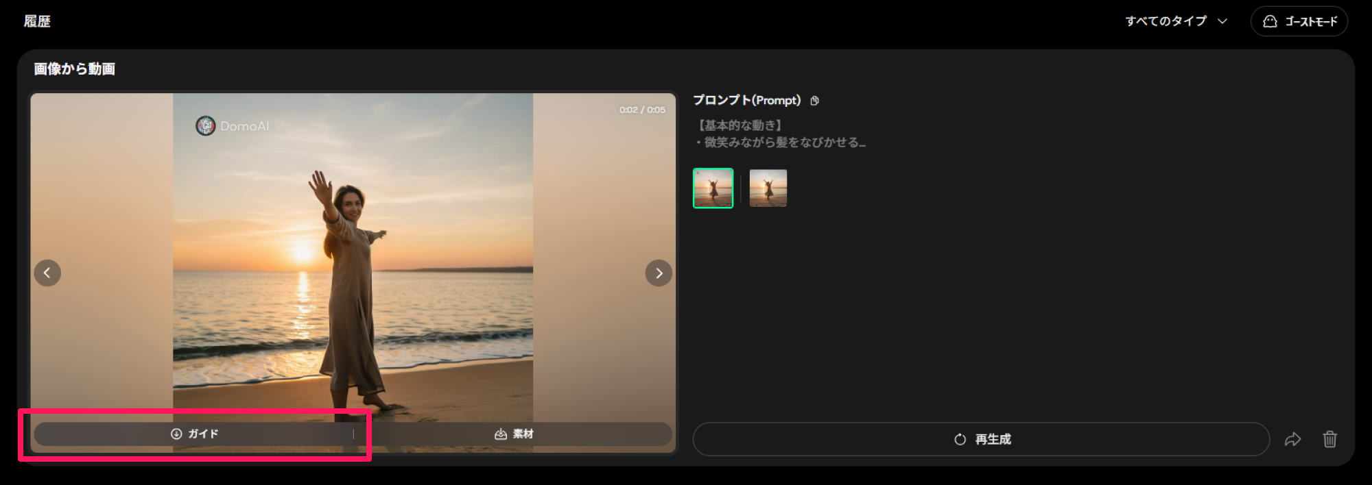 DomoAIの操作画面は非常にシンプルで、初心者にも大変適しています。複雑なプロンプトエンジニアリングは不要で、画像をアップロード→生成ボタンをクリックの2ステップで高品質な動画が完成します。