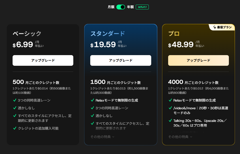 特に、スタンダードプラン(Relaxモード付き)なら、クレジットを気にせず無制限に動画生成が可能。年額プランなら最大40%OFFで利用できます。