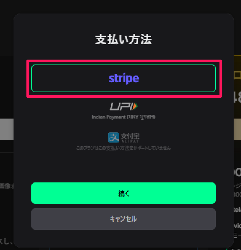 支払い方法として「Stripe」を選択し、「続く」をクリックします。