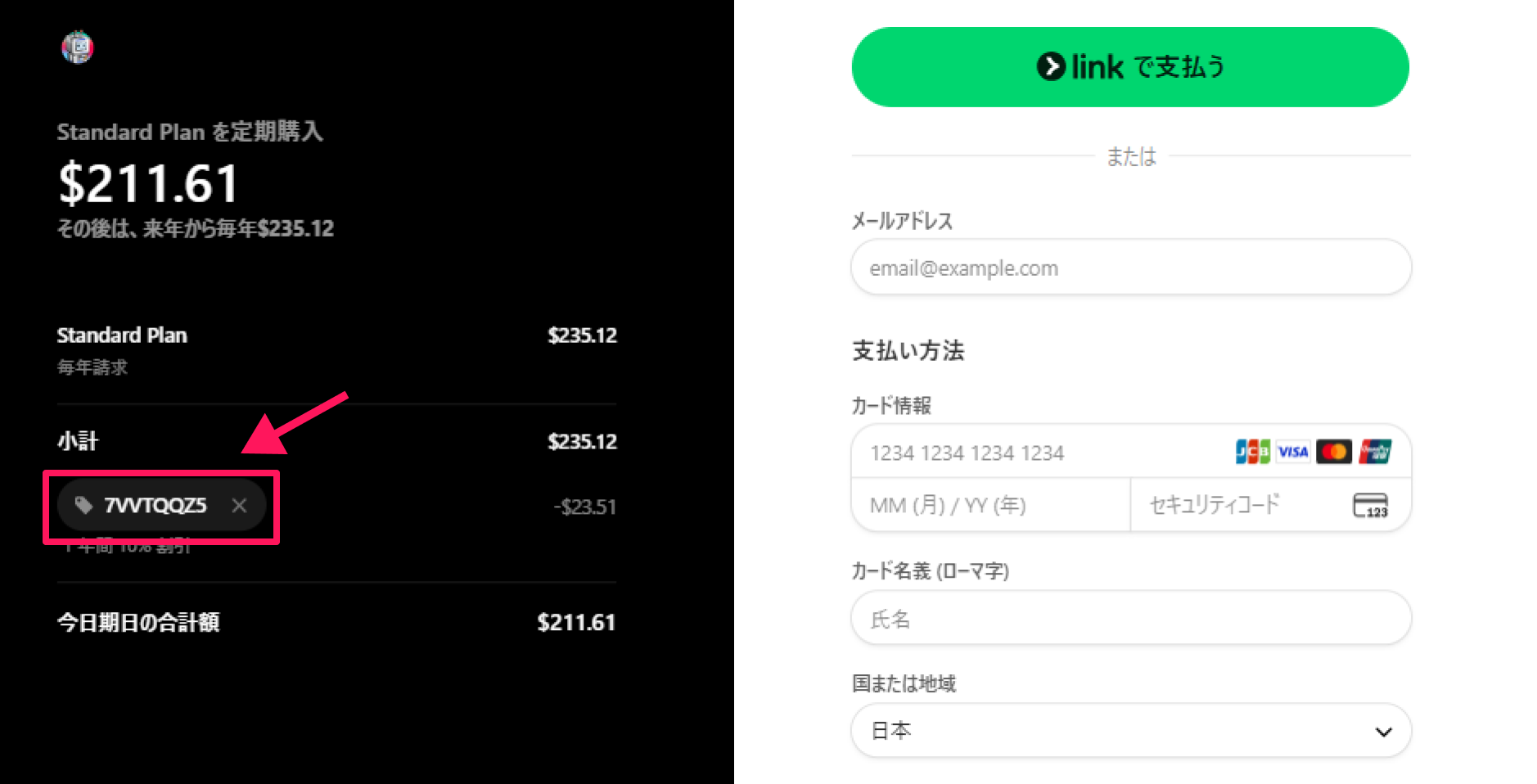 決済画面で「プロモーションコードを追加」をクリックし、以下のコードを入力します。