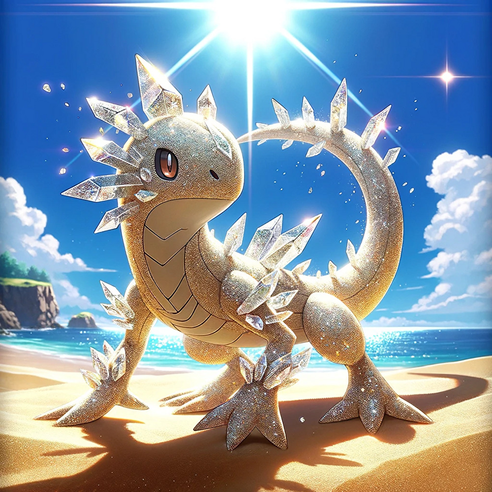 キーワード:「まさご」言葉の意味:「まさご」とは、真砂子や真砂土の略で、細かくてきれいな砂を指すことが多い。最終的に解釈すると、「細やかで清潔感のある美しさ」を表現しているという意味になるのだ。姿の参考+無機物+生物:砂粒/水晶/トカゲ全体の特徴:このポケモンは透明感のある水晶のような体を持ち、細かい砂粒をまとうトカゲのような形状をしている。体全体が日光に当たるとキラキラと輝き、まるで生きている宝石のようだ。タイプ:岩使える専用技:【クリスタルシャワー】 - 敵に向けて自身の砂粒を高速で射出し、輝きながらダメージを与える。Power:4300キャッチフレーズ:「きらめく砂の守護者、その美しさは戦いの中でも際立つ」指示:画像内にテキストを挿入しないでください。モンスター専用背景は「日差しの強い砂浜」です。モンスターは大きく中央寄りに捉えてはっきりと描写します。この情報を参考に1匹だけポケモンを生成します。お待ちください(^_-)-☆