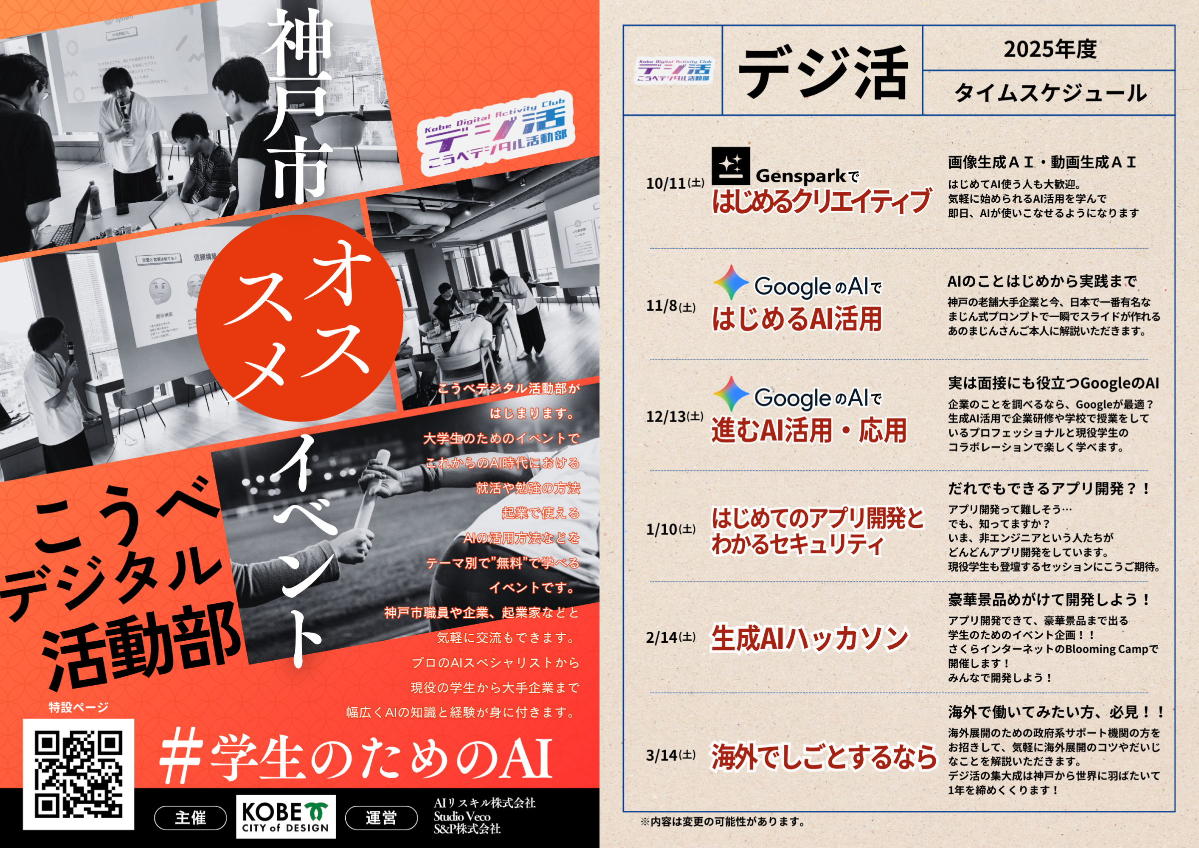 「こうべデジタル活動部(通称:デジ活)」は、神戸市が主催する学生向けデジタル人材育成プロジェクト。2025年度の「デジタル人材育成エコシステム形成事業」の一環として、2026年3月まで毎月1回、様々なテーマでイベントを開催しています。