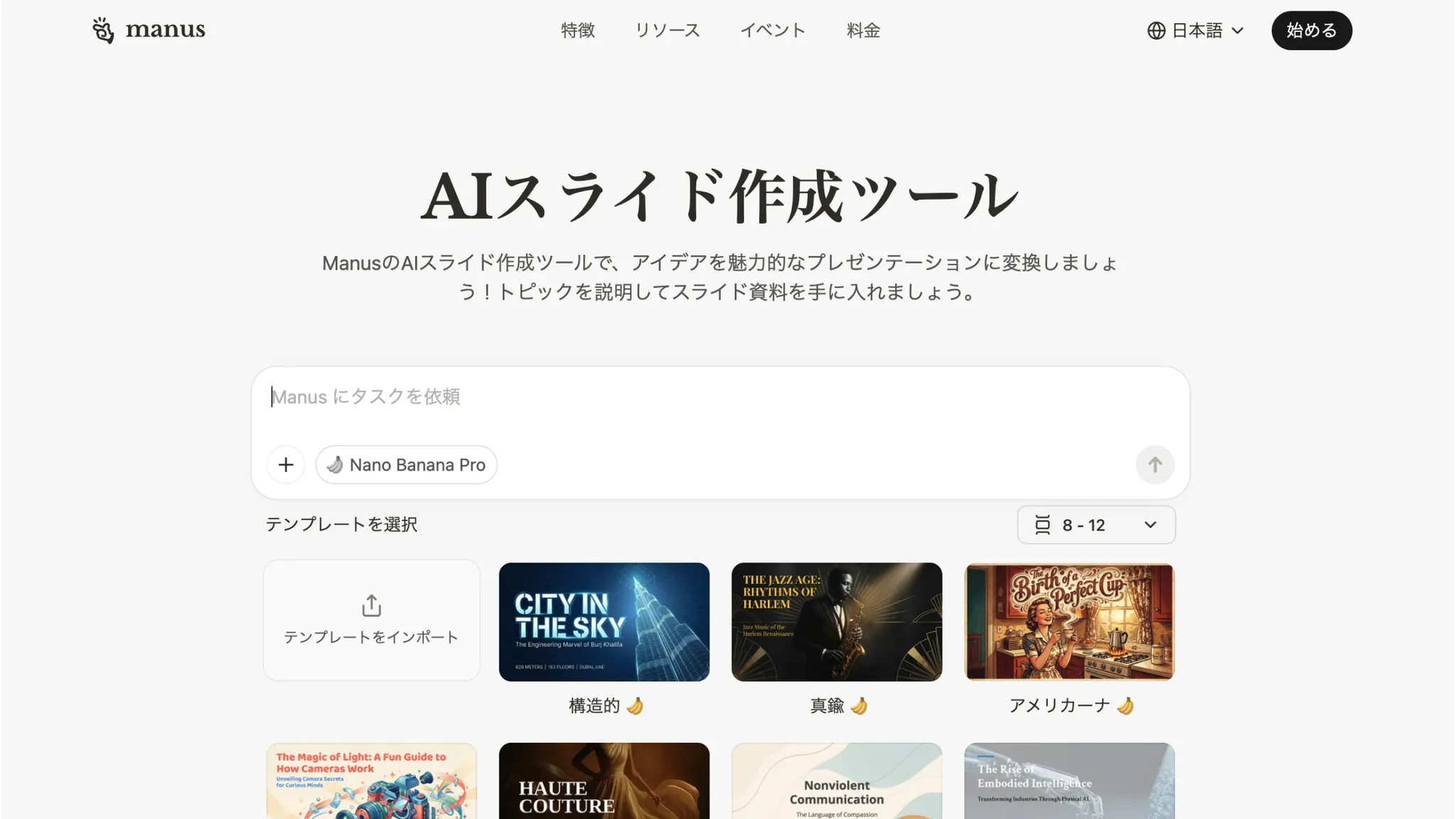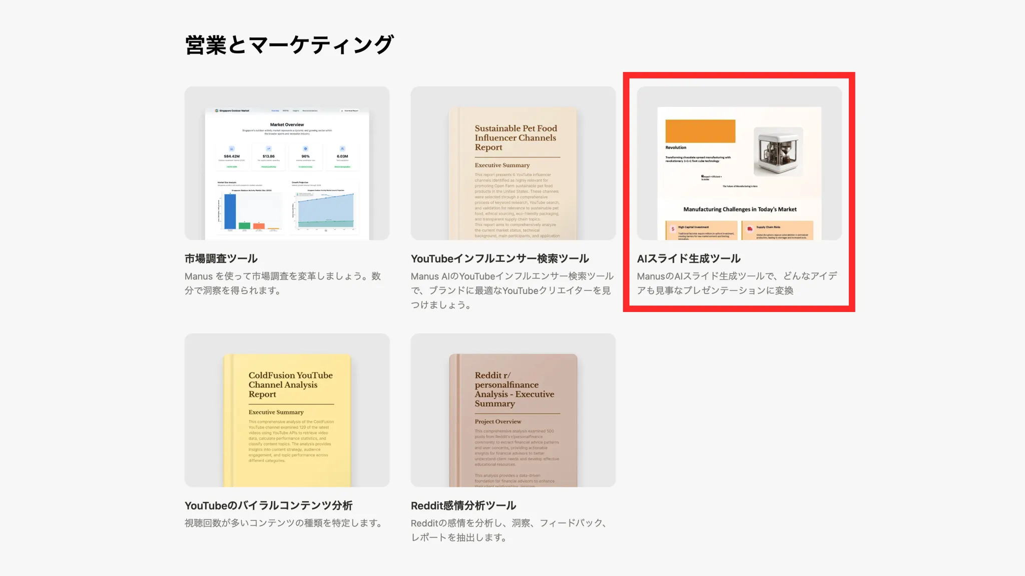 Manusのスライド作成機能は、リサーチ能力と構成力が強みです。Web上の最新情報を集めて分析し、論理的なストーリーを組み立て、洗練されたデザインのスライドに仕上げるところまで、ワンストップで完結します。