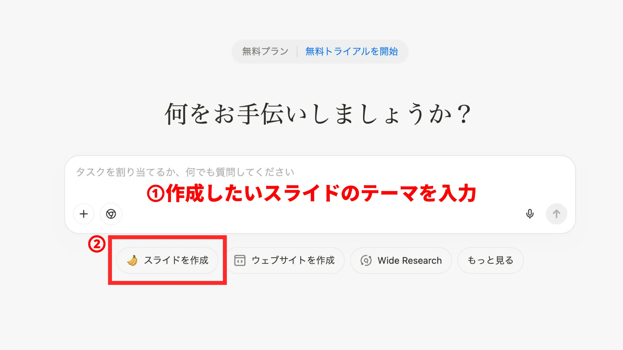 ① テーマ入力 → 「スライドを作成」ボタンを押す