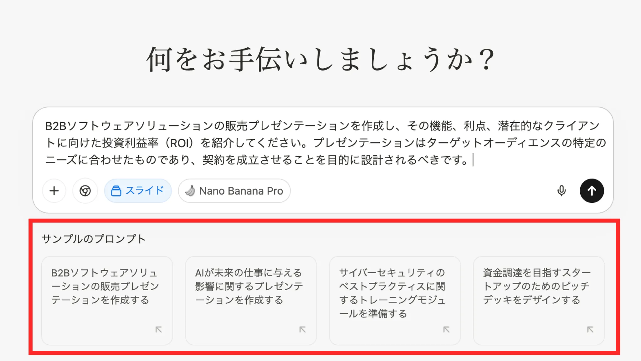 テーマ入力欄にはサンプルプロンプトも用意されているので、参考にしてみてください。