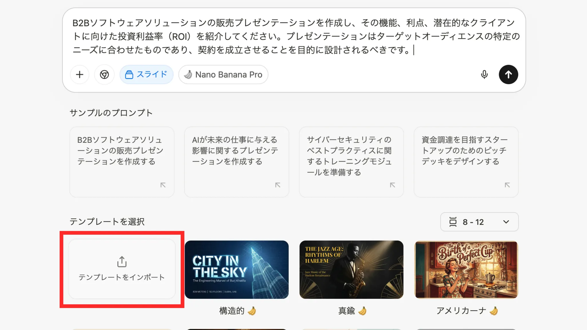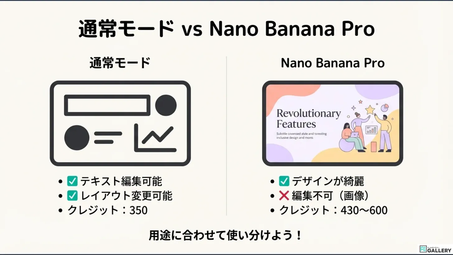 Nano Banana Proは、デザイン性の高いスライドを画像形式で出力します。見た目は綺麗ですが、編集ができない点に注意が必要(近日中に編集機能に対応予定)です。クレジット消費は通常モードより多めです。