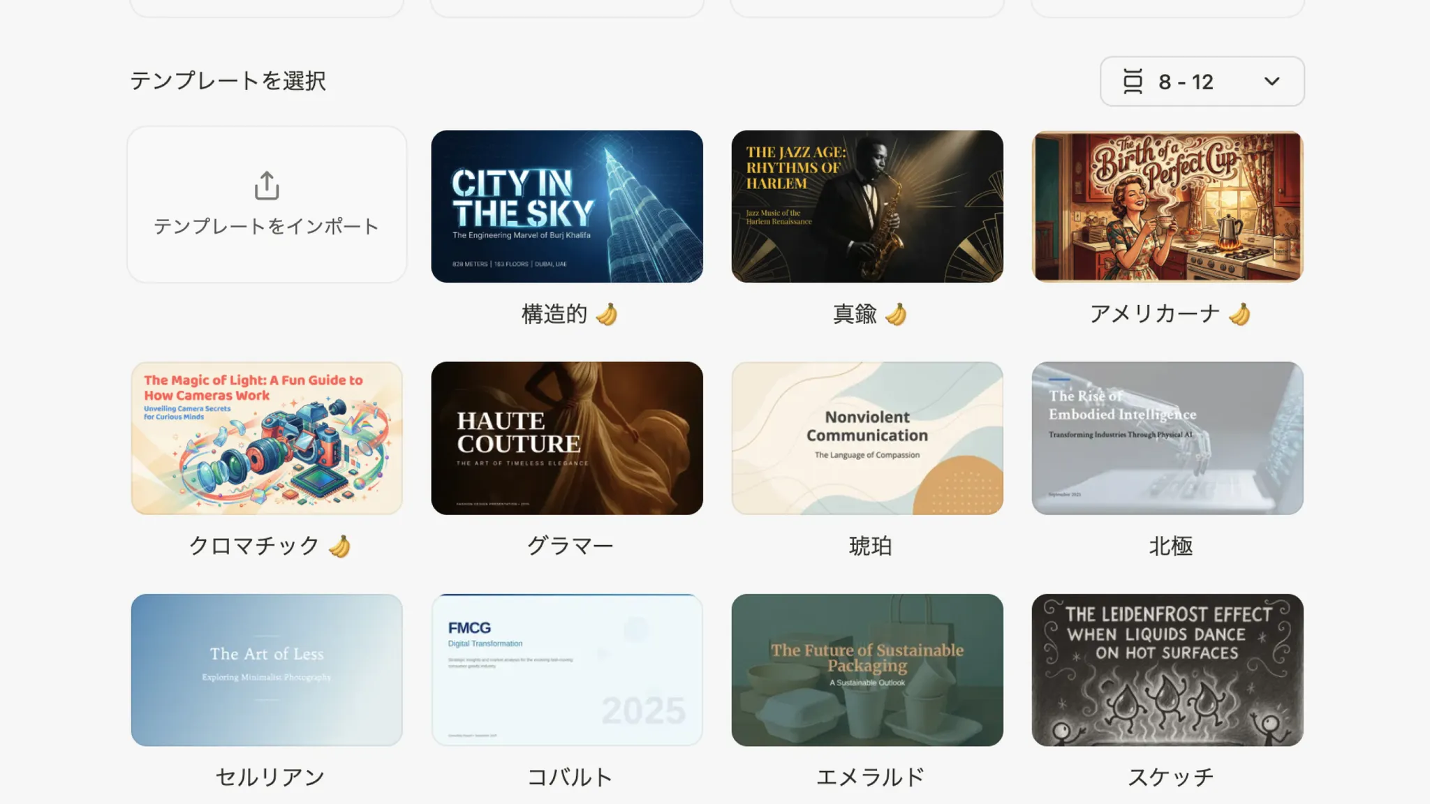 自社や個人のPowerPointテンプレート(.pptx形式)をアップロードするだけで、そのデザイン、レイアウト、フォント、配色をスライドに自動で適用できます。