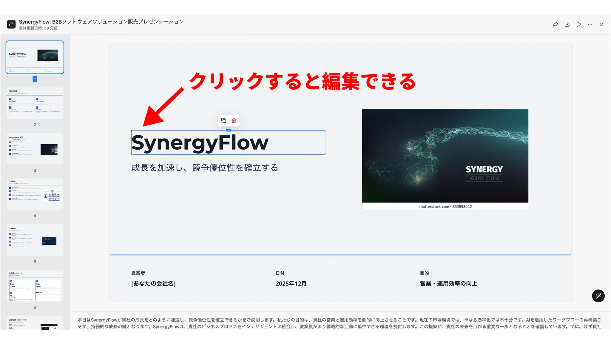 AIが生成したスライドはそのまま使えるレベルですが、もちろん後から編集・調整もできます。