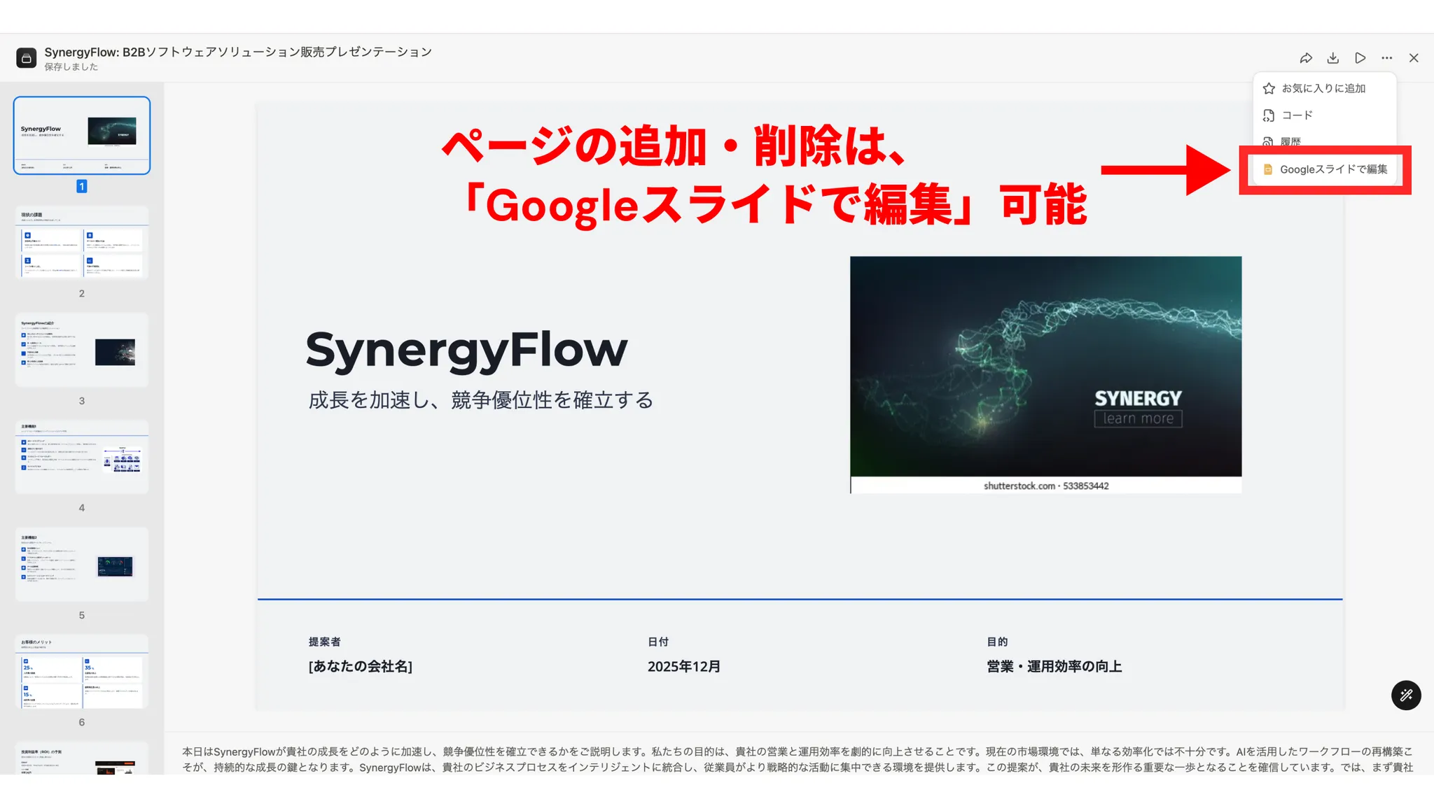- ページの追加・削除:「Googleスライドで編集」を押せば、不要なスライドの削除や、新しいページの追加ができます。