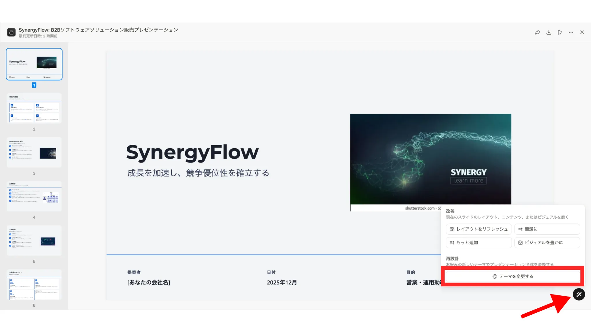 - テーマ変更・自動レイアウト機能:全体のデザインテーマを変えたり、「スマートレイアウト」機能で要素の配置をワンクリックで最適化したりもできます。