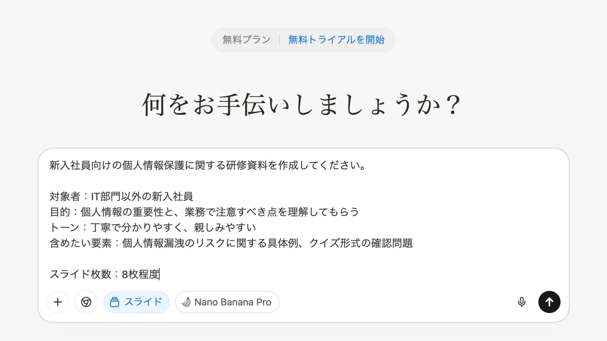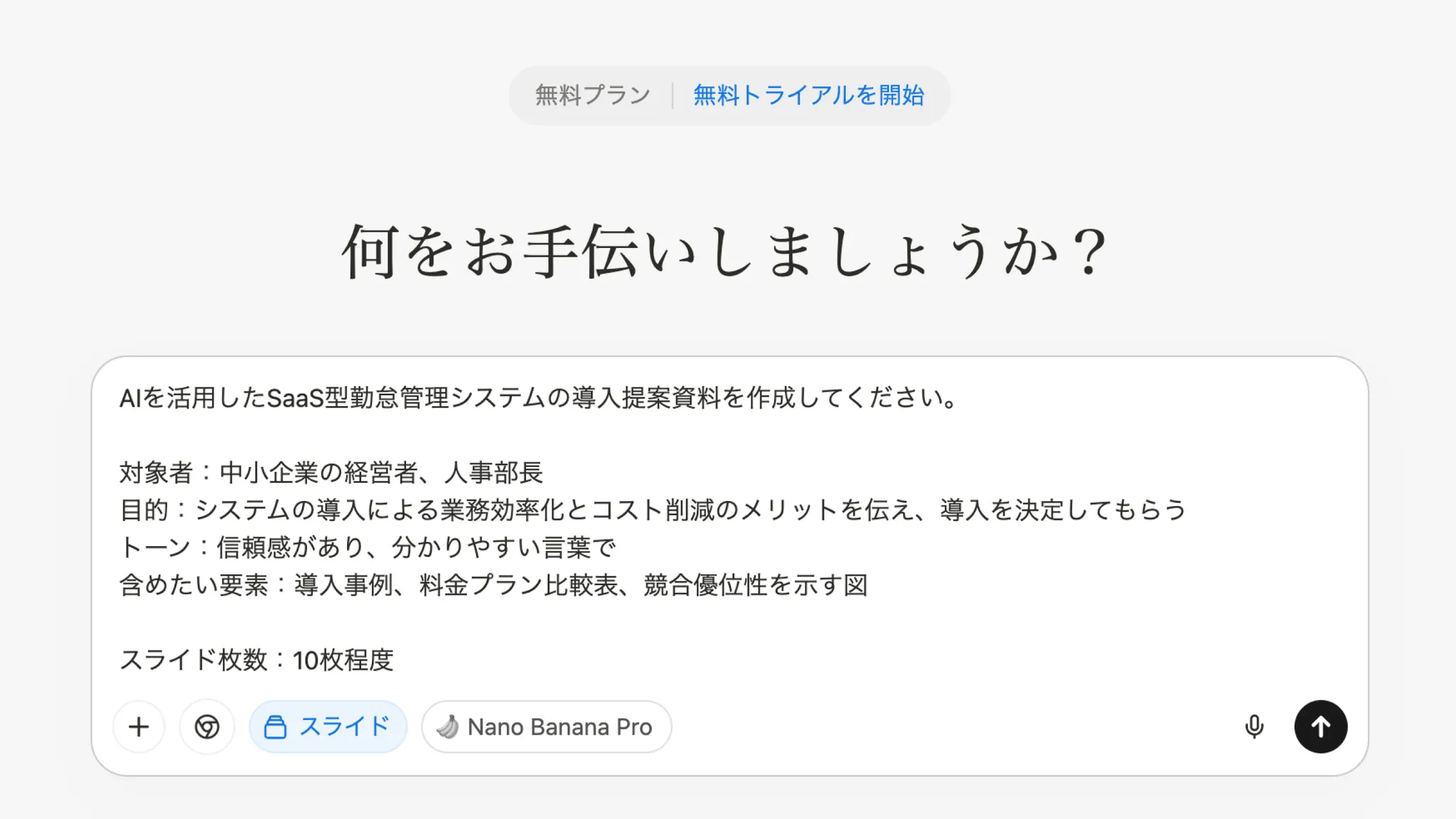 例えば、「新製品のマーケティング戦略」「2025年度上半期の業績報告」のように、具体的で分かりやすいテーマを入力し、「スライドを作成」ボタンを押すだけです。