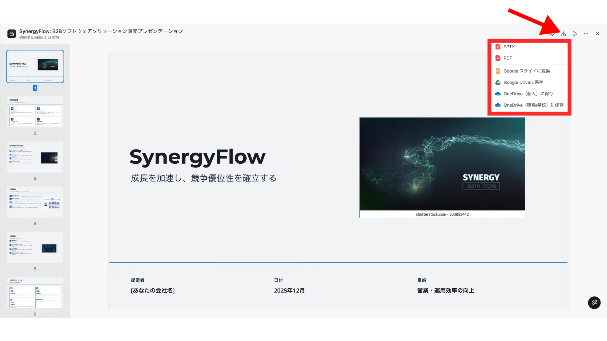 Manusで作成したスライドは、画面右上のエクスポートメニューから、PowerPoint(.pptx)、Googleスライド、PDFなど、幅広い形式で書き出せます。