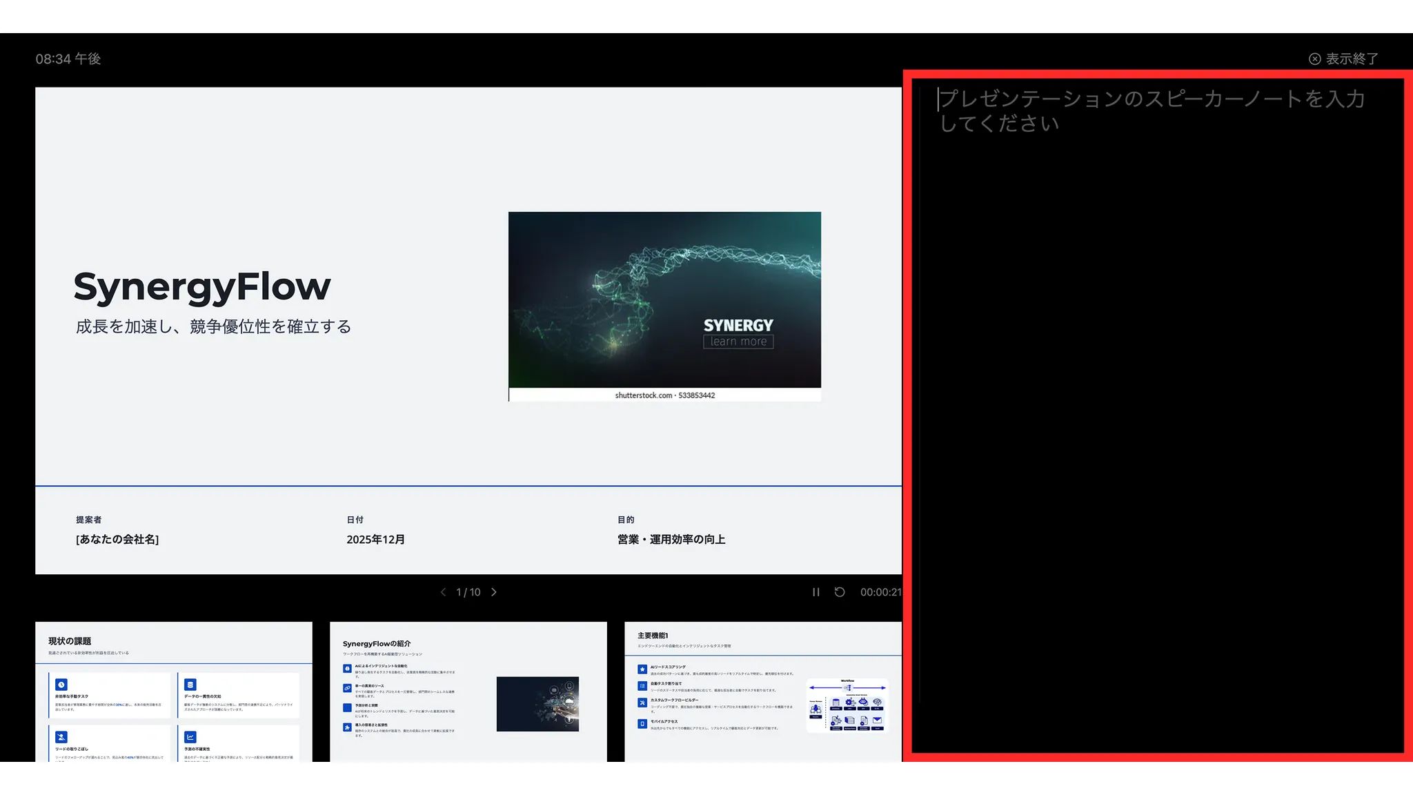 完成したスライドは、さまざまな形式で出力して実際のプレゼンに活用できます。