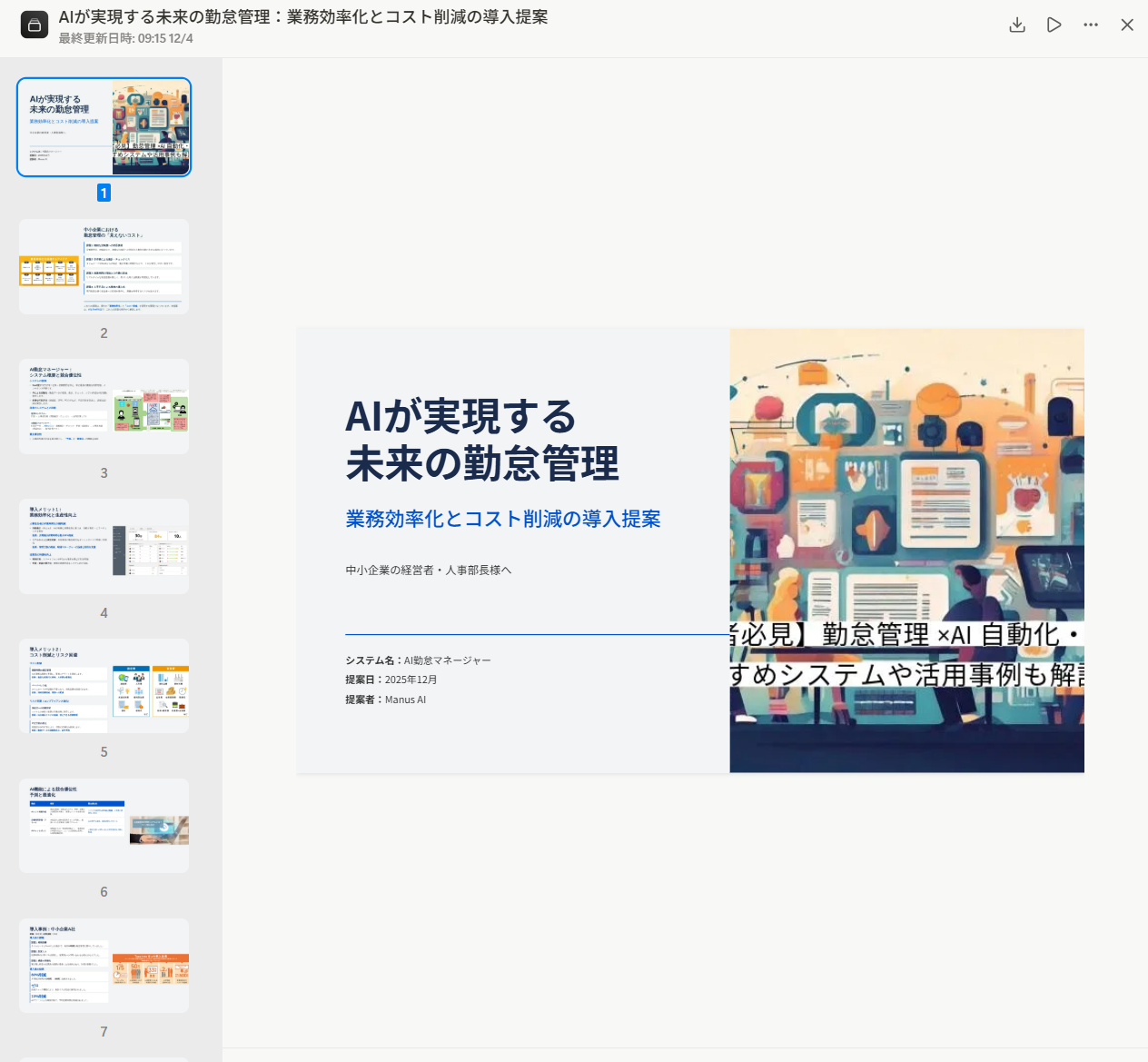 - あくまで「たたき台」として:Manusは強力な「たたき台」作成ツールです。最終的な仕上げは、自身の知識と経験を加えて行うことが、質の高いプレゼンテーションにつながります。