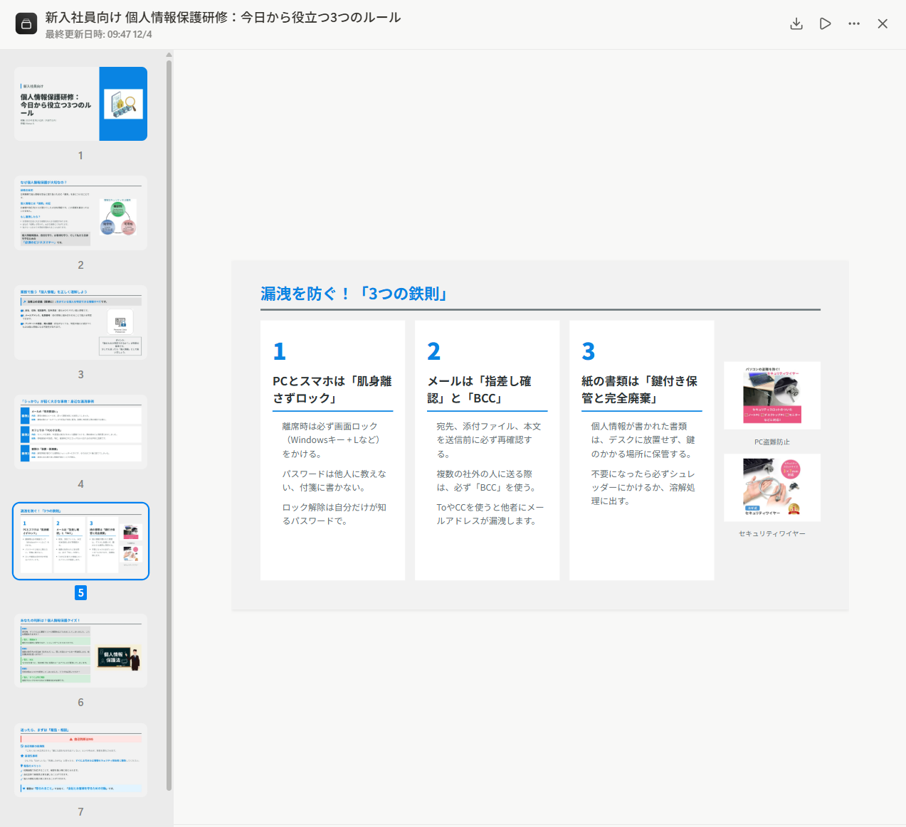 含めたい要素:個人情報漏洩のリスクに関する具体例、クイズ形式の確認問題