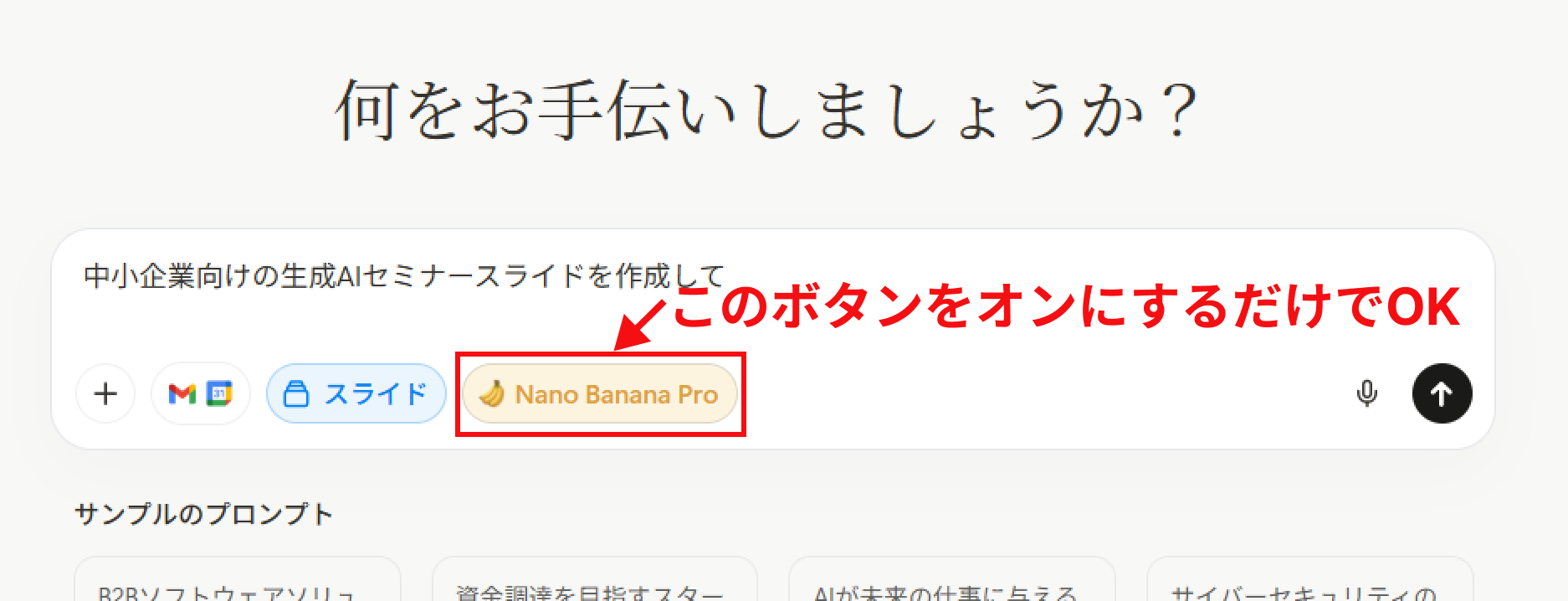使い方はシンプルで、スライド作成時に「Nano Banana Pro」ボタンをオンにして実行するだけ。特別な設定は不要です。