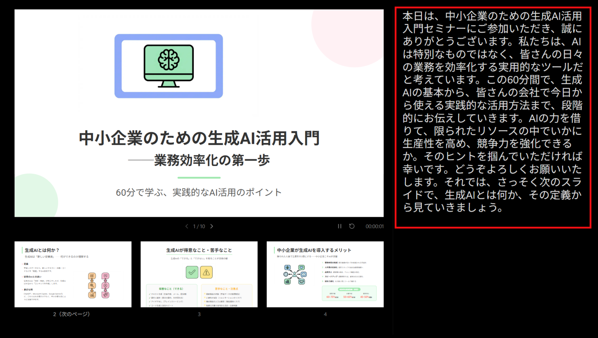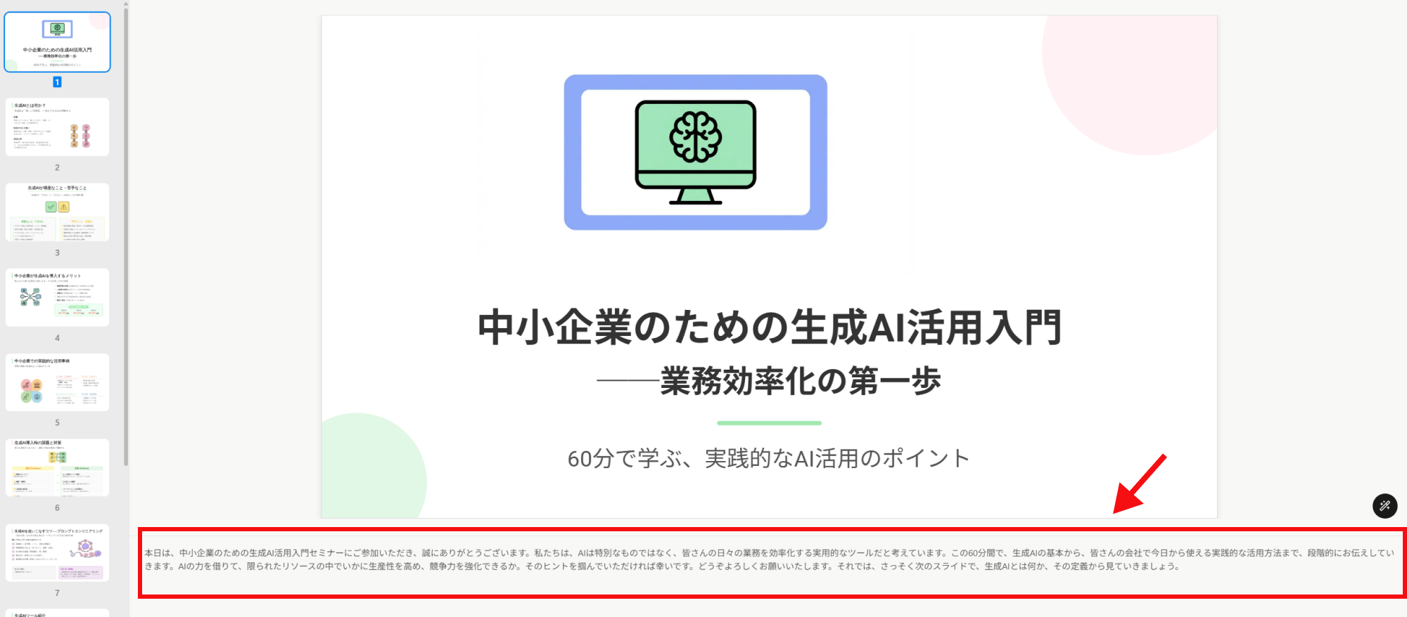 - テキスト編集:各スライドのタイトルや本文を、自分の言葉に直したり、ニュアンスを調整したりできます。