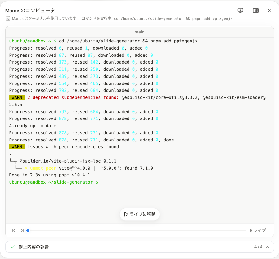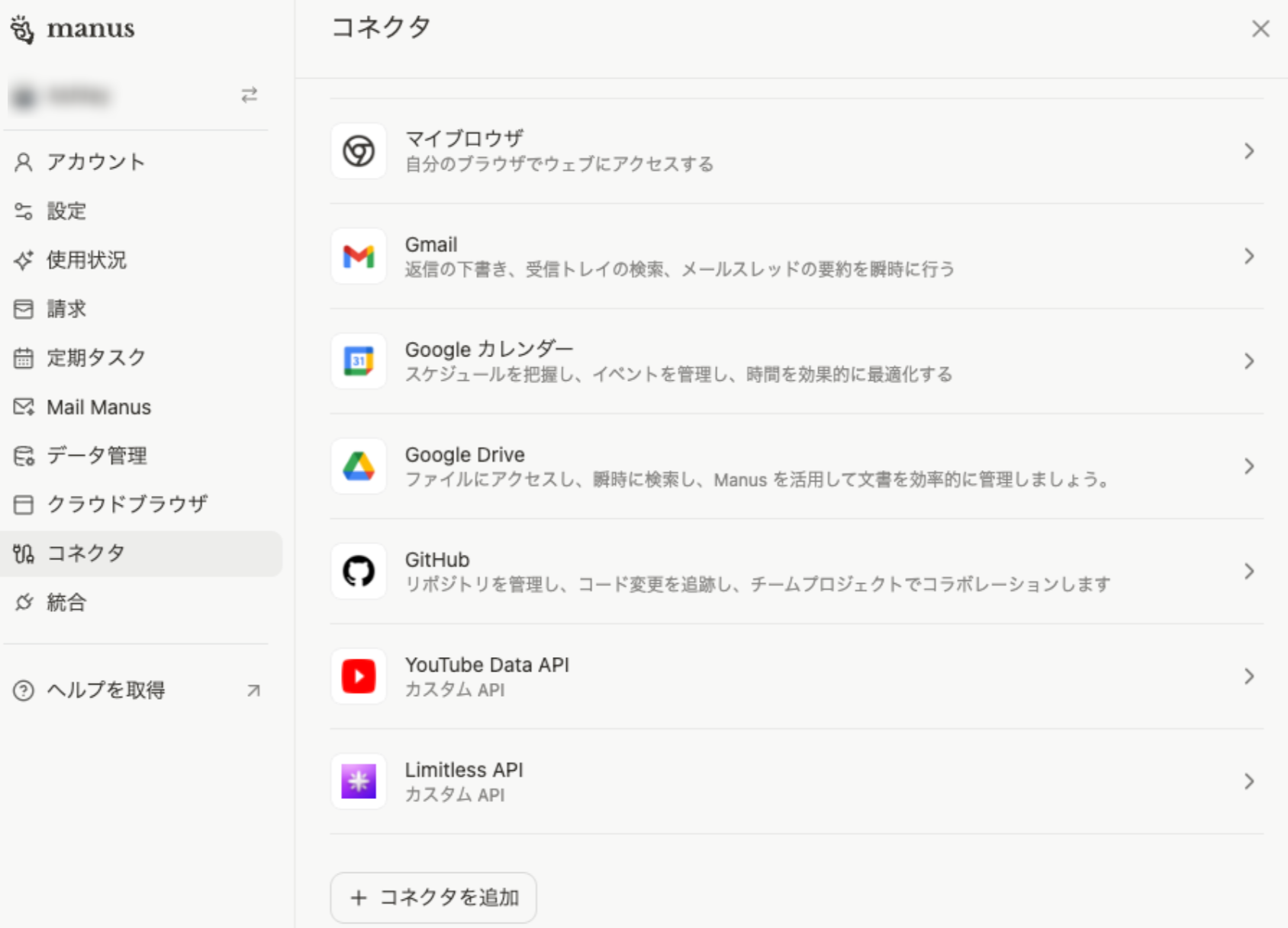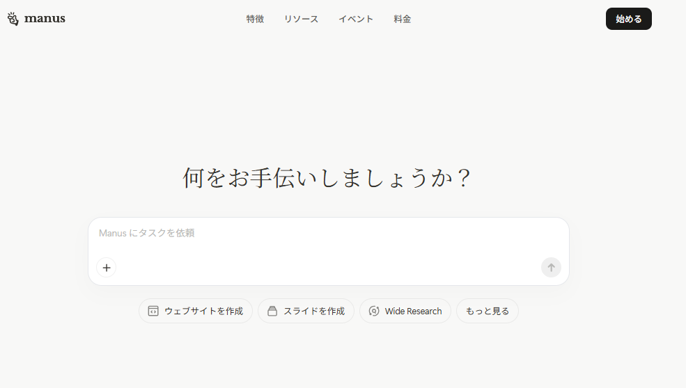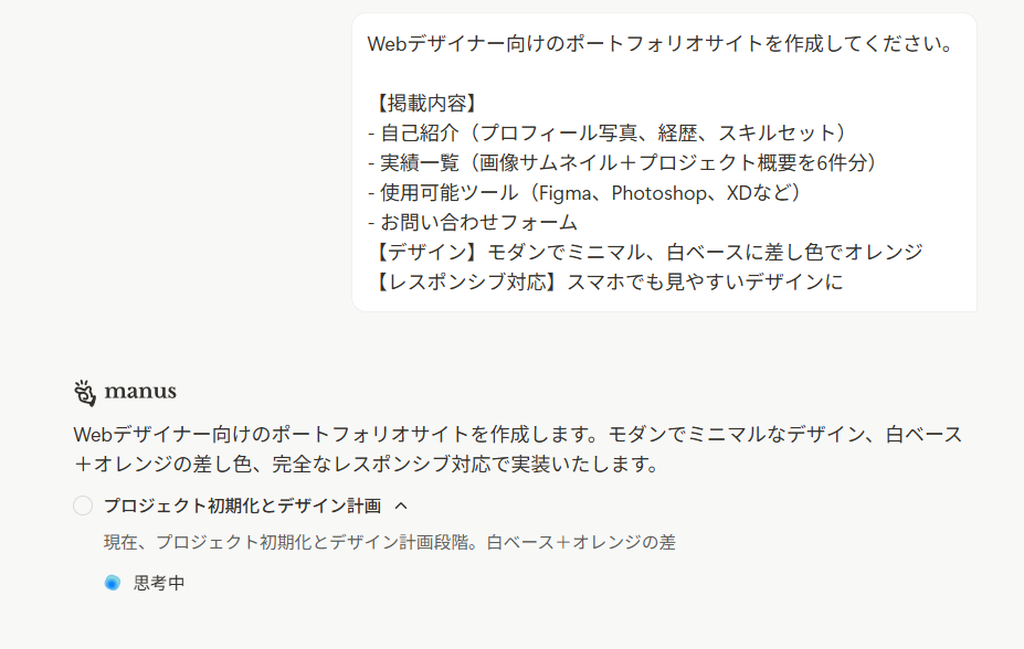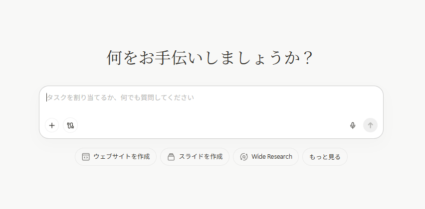ManusのUIは日本語に対応しており、プロンプトも日本語でそのまま入力可能です。生成されるコンテンツも日本語で出力されます。