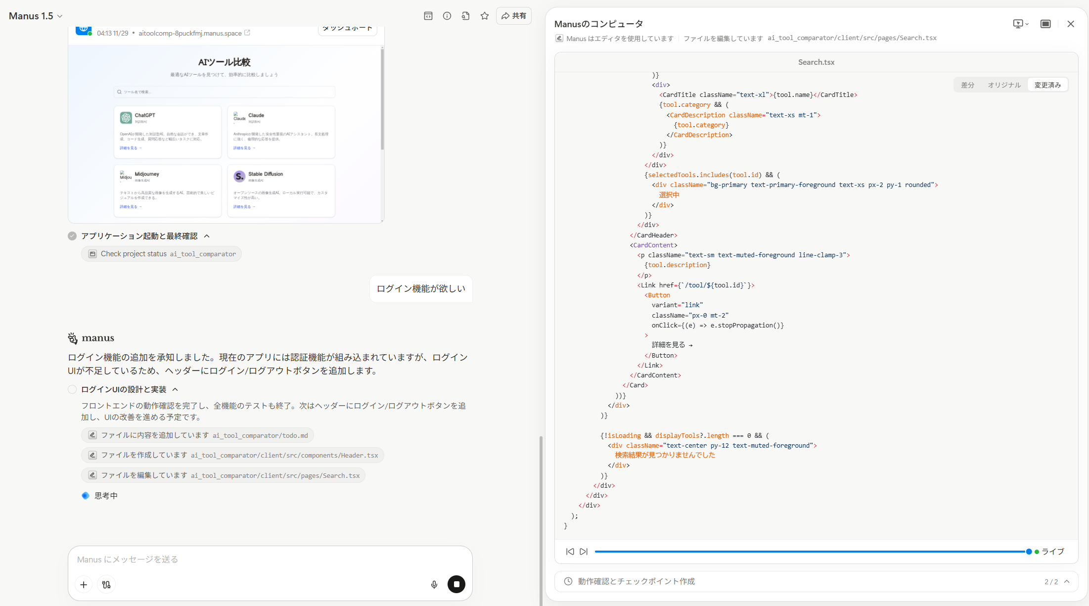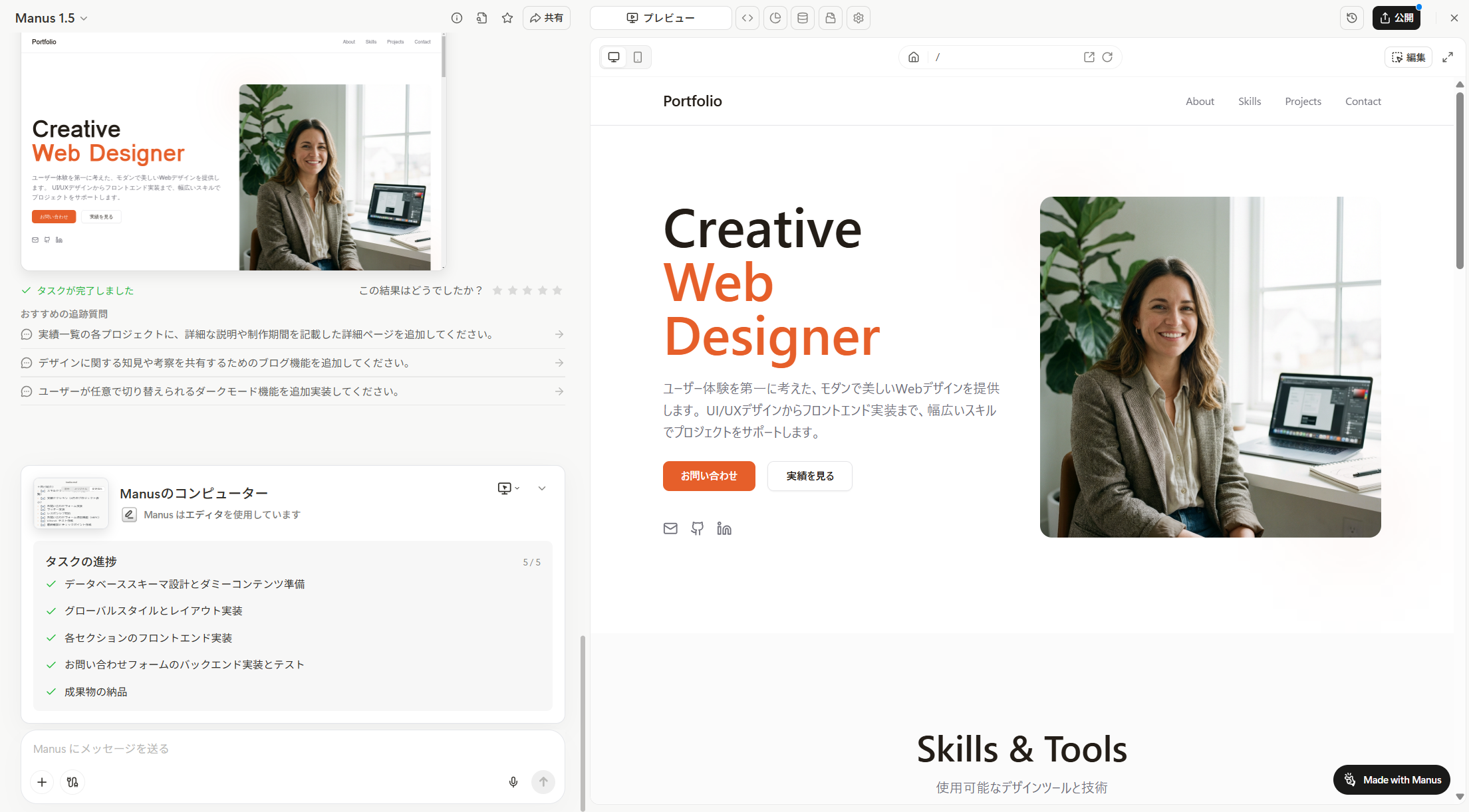 2025年10月のManus 1.5アップデートにより、フルスタック構成のWebアプリも作成可能になりました。