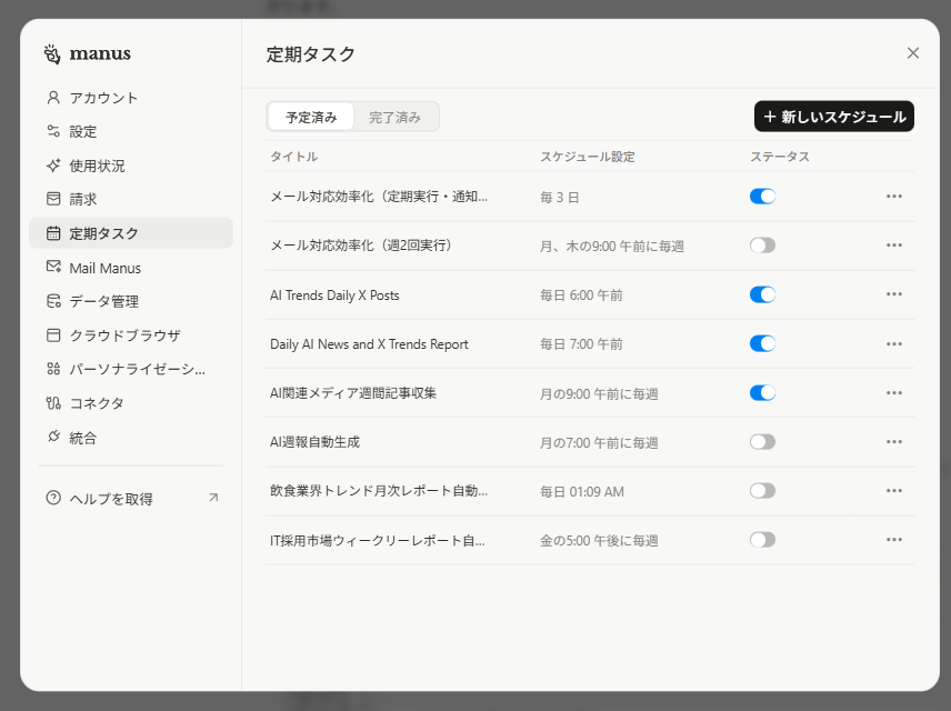 登録は簡単です。Manusのチャットで「毎朝7時に〜を実行して」と伝えるだけ。Manusが自動で定期タスクとして登録してくれます。