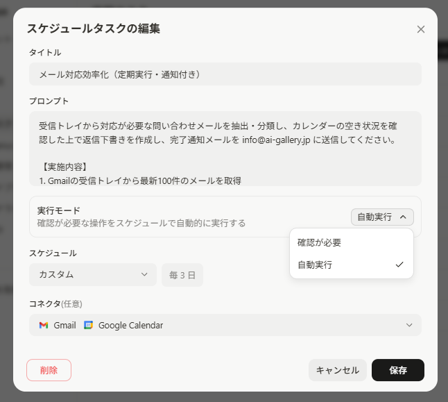 「確認が必要」モードにすると、実行前に内容を確認してから実行できます。最初はこのモードで試して、問題なければ「自動実行」に切り替えるのがおすすめです。