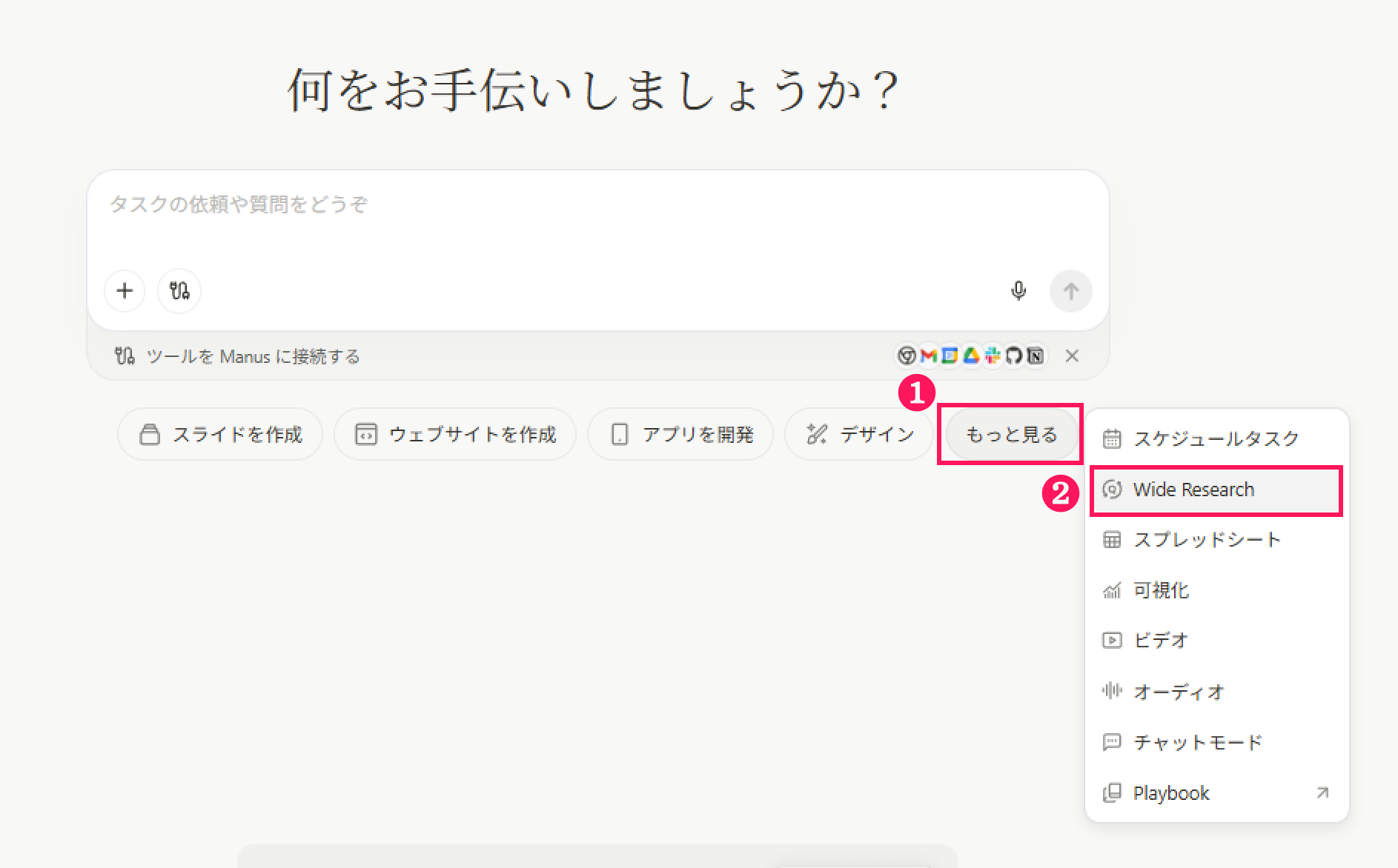 「もっと見る」メニューには、Wide Research以外にも「スケジュールタスク」「スプレッドシート」「可視化」などの機能があります。目的に応じて使い分けてください。