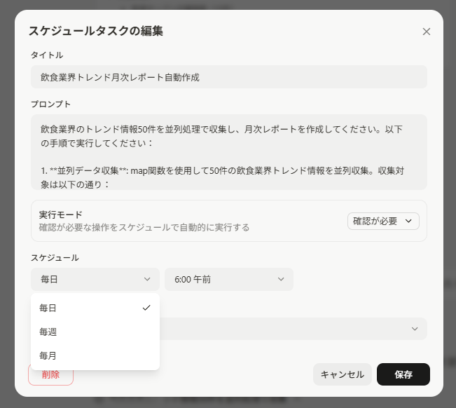 毎朝7時にニュースを収集してレポートを作成する、毎週月曜に競合ブログをチェックする、といった繰り返し作業を完全に自動化できます。
