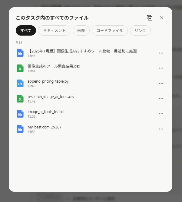 なお、プロンプトで「50件を並列処理で調査して」と指定すれば、通常のチャットからでもWide Researchが起動することがあります。ただ、確実に並列処理を使いたい場合は、上記の手順でWide Researchモードを選択してから指示を出すのがおすすめです。