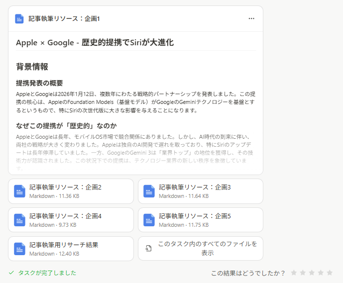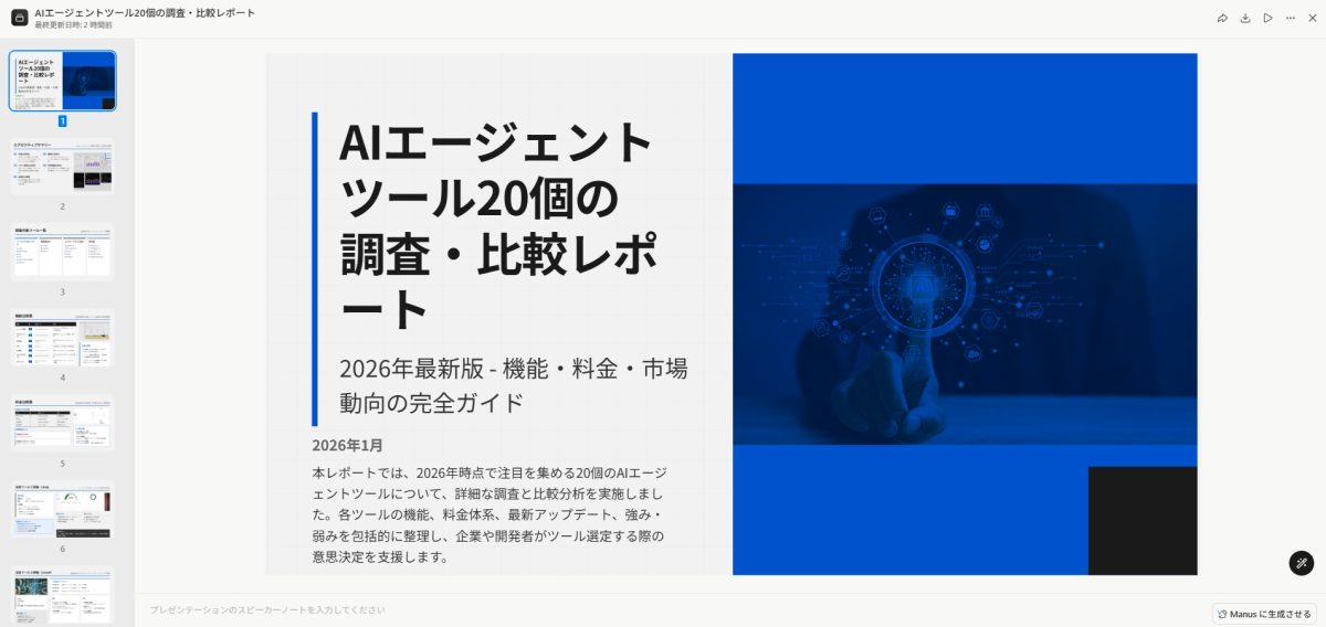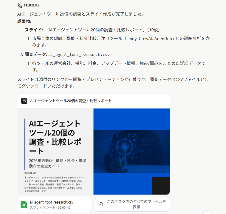 Manusは一度指示を出すと、最後まで自走してくれるのが強みです。50件の調査から記事構成まで、途中で止まることなく完了しました。