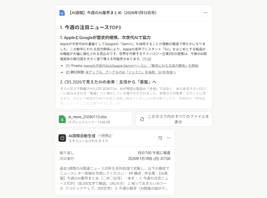 この2つを組み合わせると、「50社の競合調査→レポート作成」といった作業を、毎週自動で回すことも可能になります。