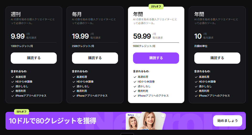 これらの有料プランには「高速処理」「HDから4K画像」「透かしなし」「商用利用」「iPhoneアプリへのアクセス」といった機能がすべて含まれています。