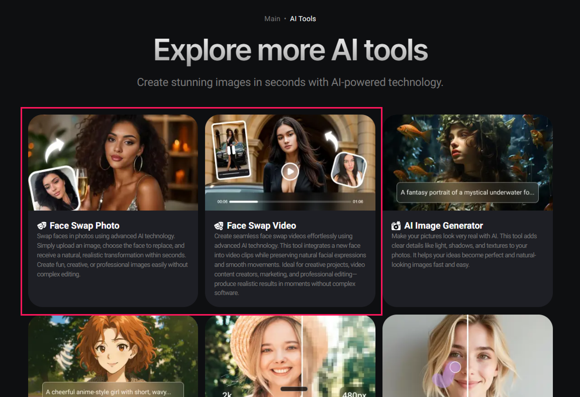 ここでは注目の機能「Face Swap」「高画質化」の使い方を解説します。