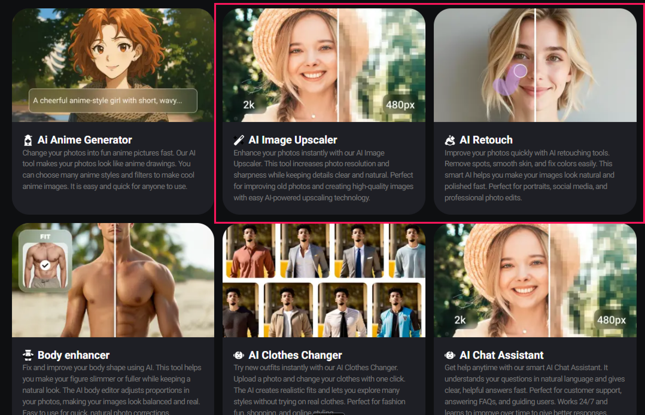 「Upscaler(高画質化)」や「Retouching(レタッチ)」機能も強力です。有料プランでは「HDから4K画像」への高画質化も明記されています。