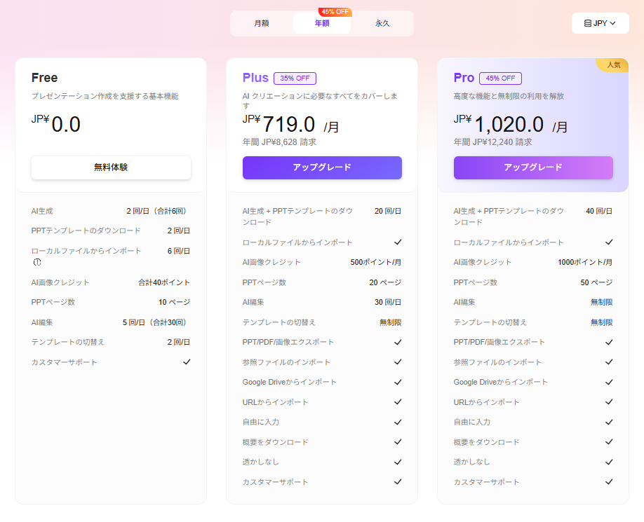AiPPTは無料プランを含む3つの料金体系を用意しています。