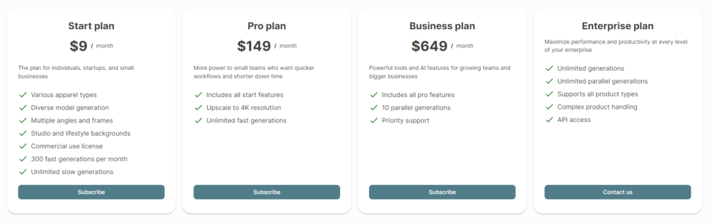 - Start Plan:月額$9。300回の高速生成、無制限の低速生成、商用利用ライセンスを含む。