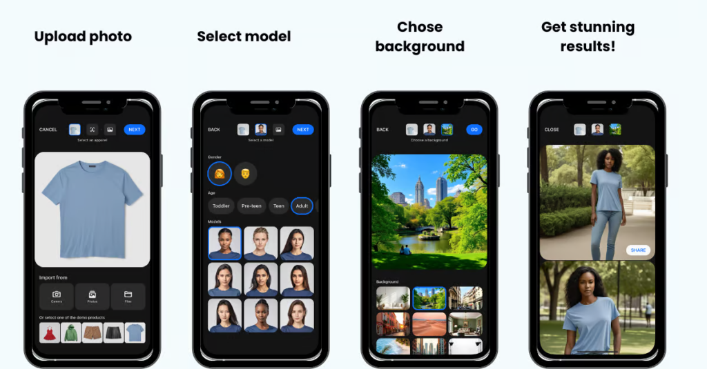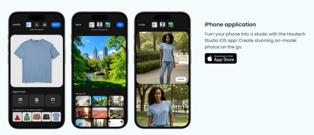 「Hautech Studio iOSアプリ」を使用することで、スマートフォンから直接、簡単にモデル写真を生成できます。